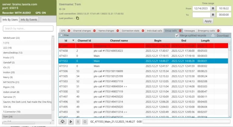 la capacidad de analizar los movimientos del usuario en función del historial de ubicaciones GPS. Para mantener los datos seguros, todos los registros de datos y voz se almacenan en el servidor de TASSTA. También le permite hacer una copia de seguridad de todas las comunicaciones de voz en una unidad local.